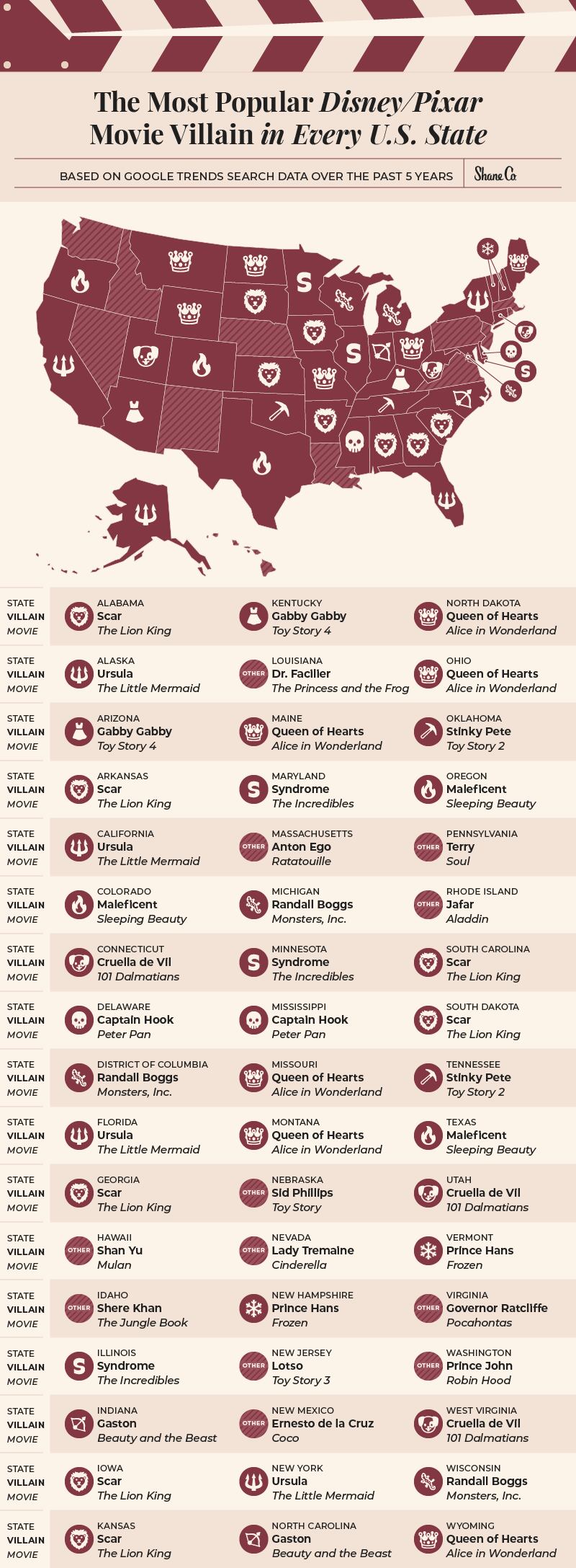 Shane Co. compiled a list of 45 Disney/Pixar films and used Google Trends to analyze the search volume of each villain over the past five years.