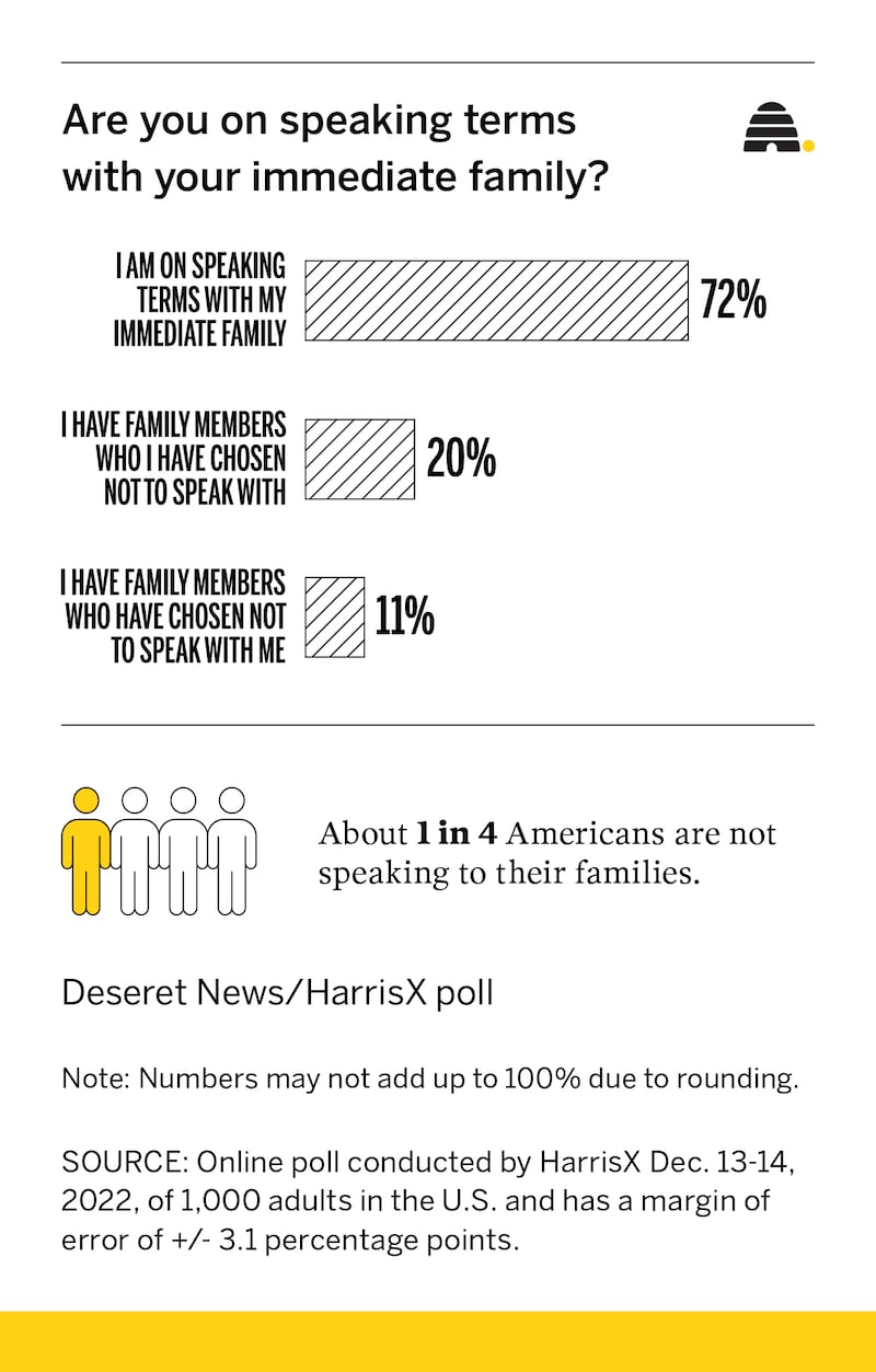 While more than 7 in 10 adults said they are on speaking terms with the members of their immediate family — think parents, children, siblings — roughly a fourth said they are not speaking to a member of their family, according to a HarrisX poll for Deseret News conducted last week.
