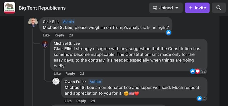 Utah Republican Sen. Mike Lee responded Saturday on the Big Tent Republicans Facebook group page to questions about Trump’s statement.