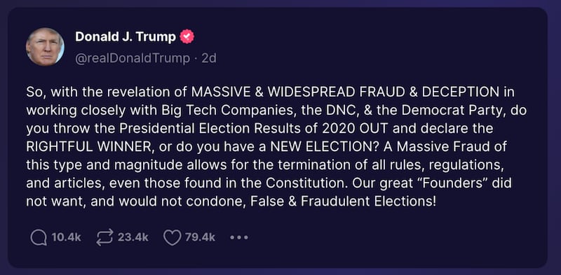 In his post over the weekend, Trump asks on his Truth Social account if the “revelation of MASSIVE & WIDESPREAD FRAUD & DECEPTION in working closely with Big Tech Companies, the DNC, & the Democrat Party, do you throw the Presidential Election Results of 2020 OUT and declare the RIGHTFUL WINNER, or do you have a NEW ELECTION?”