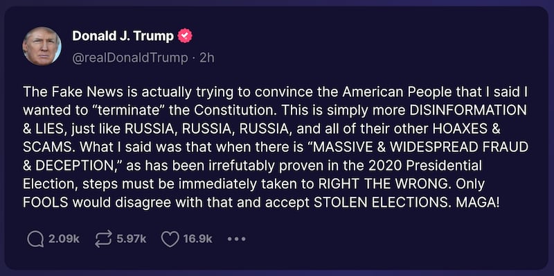 Monday morning, Trump appeared to walk back his comments. “The FAKE NEWS is actually trying to convince the American People that I said I wanted to ‘terminate’ the Constitution. This is simply more DISINFORMATION & Lies ... What I said was that when there is ‘MASSIVE & WIDESPREAD FRAUD & DECEPTION,’ as has been irrefutably proven in the 2020 Presidential Election, steps must be immediately taken to RIGHT THE WRONG.”