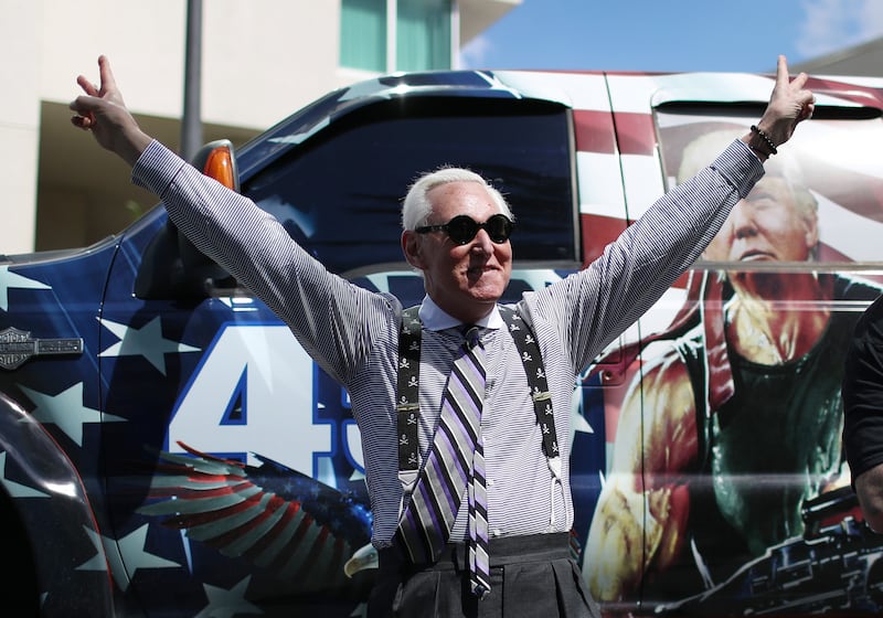 When Roger Stone arrived at Strikes, a South Florida lounge situated in one of Boca Raton’s many downtown parking lots, he stood out like a hanging chad. The political consultant and former Trump adviser had been scheduled to speak before a group of several dozen men. Most came in T-shirts, and most of those read: “ROGER STONE DID NOTHING WRONG.” But Stone strolled in wearing a gray three-piece suit with widely pleated pant legs and even wider lapels. For anyone playing I Spy, Stone offered an easy cheat; he was the guy with an actual pocket watch.