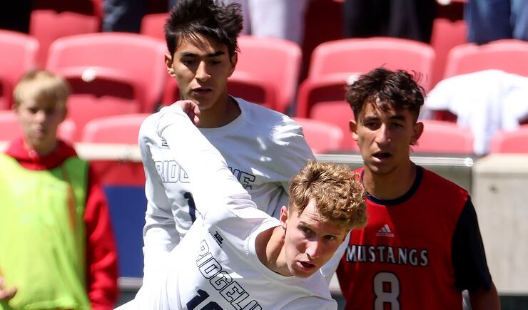 Ridgeline’s defense had done well on Manwaring’s runs out of the midfield all game, but in the 90th minute he popped the ball up over one defender at the top of the box, which forced two other defenders to collapse and block his shot. It created just a brief moment of disorganization at the back and that was enough time for Crimson Cliffs to pounce.