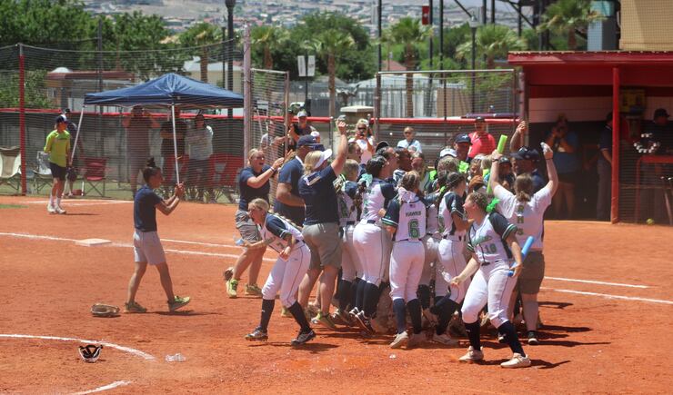 ST. GEORGE — An offensive burst in the seventh inning by Ridgeline lifted the pressure that had been exerted the previous inning by Bear River and pitcher Markessa Jensen could breathe easy with an 8-2 cushion to get the final three outs of the game and bring home the 4A state hardware for the Riverhawks.