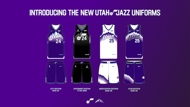 In the 2025-26 season, the 2024-25 city jersey will go away, and two new jerseys will be introduced to complete the transition — a purple mountain jersey that closely resembles the city edition worn in 2023-24, and a white version of that, with purple gradient mountains, black numbers and a white and gray “Utah” wordmark. Those two jerseys will be the “association” and “icon editions,” with the black jersey becoming the “statement” jersey. A new city jersey, yet to be revealed, will round out the 2025-26 uniform set.