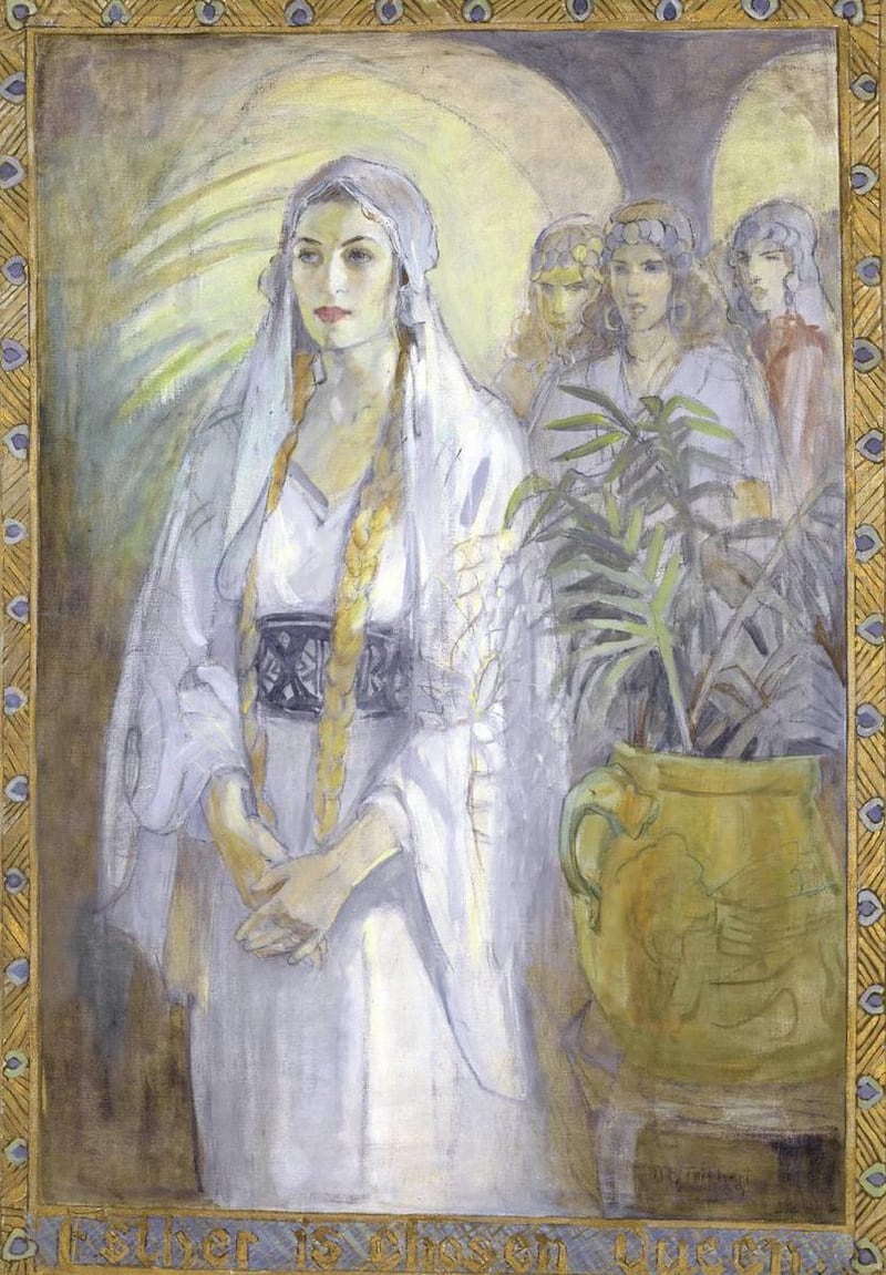 One of Teichert’s most famous paintings was a portrait of Queen Esther from the Hebrew Bible. This painting includes one of Teichert’s characteristic borders, which mimics a mural style. Her broad brush-strokes create hazy figures in the background, with Esther as the prominent figure of the painting.