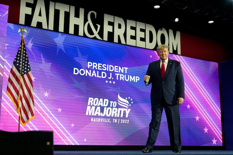 As the first notes of “I’m Proud to be an American” sounded, former President Donald Trump took the stage in Nashville, Tennessee, last week at the Faith and Freedom Coalition’s annual Road to Majority conference. He stood by the American flag for the entirety of the song, looking out at the crowd with his trademark expression that falls somewhere between a smile and a smirk.
