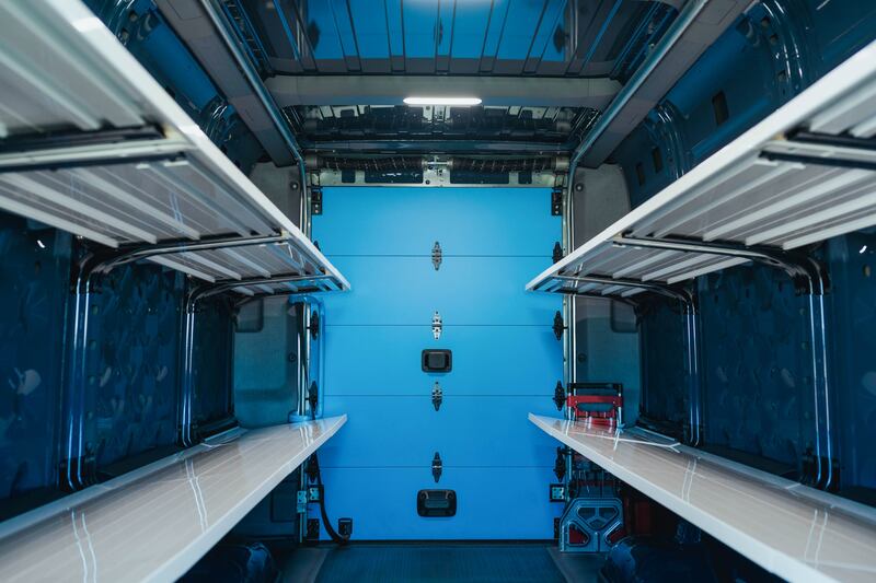 Rivian’s custom electric delivery van is embedded with state-of-the-art safety sensors, automatic emergency braking, 350-degree visibility and seamless navigation that guides an Amazon driver to the next address while displaying customer information on its large touch screen.