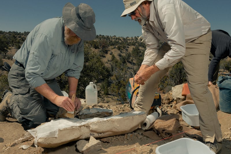 Once they’ve isolated the pieces they want to collect, they place the smallest bones and bone fragments into clear Ziploc bags while covering the larger ones with wet paper towels. Then they mix up a tub of plaster, slather strips of burlap, and wrap the exposed fossils with their bare hands. The plaster leaves behind an unmistakable white tint on everyone’s palms, reminiscent of the white-powdered war boys of “Mad Max.” Once the plaster hardens, they chisel away at the rock underneath until the bone can be flipped upside down, with another plaster coat destined for the underbelly. And once the bone is fully plastered, they can haul it away — by hand if it’s small enough, but more often by helicopter, since these chunks of bone and rock can weigh over a thousand pounds.