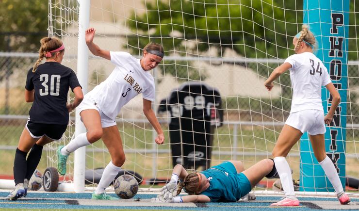 An attempt by Lone Peak in the 28th minute went off McKeon’s hands for her fifth stop in the first half. Lone Peak nearly scored again in the final minute of the half when another deflection by McKeon went off the post and danced along the goal line without going in. Farmington’s defender got there just in time to boot it away before it became an easy goal for the Knights.