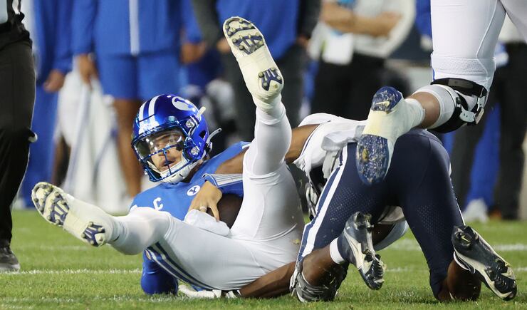 The Cougars committed double-digit penalties for the second-straight week (10, for 82 yards) and will be without cornerback Gabe Jeudy-Lally the first half against Notre Dame because the Vanderbilt transfer was ejected for targeting in the second half when BYU led 31-20 and the game was still in doubt.