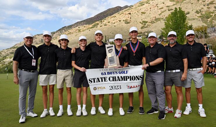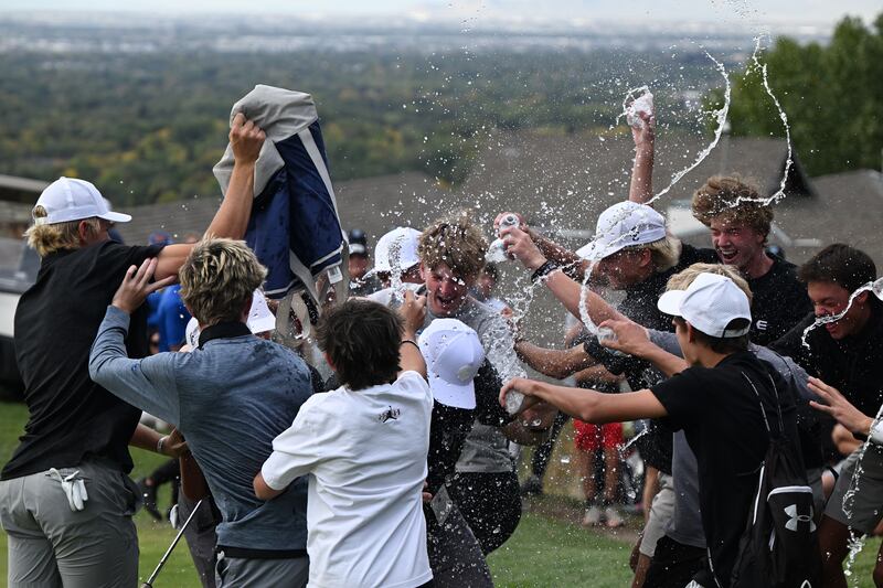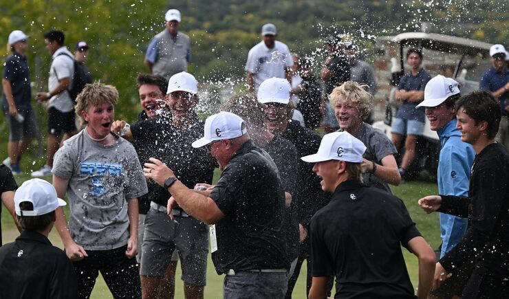 As Corner Canyon junior Bowen Mauss hugged coach Derek Fox to celebrate his 6A individual title by two strokes, the pair was mobbed by the rest of the Chargers team and were doused with buckets and bottles of water in celebration of the first boys golf state title in school history.