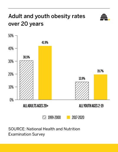 Calling obesity “a serious and growing public health threat,” the report lists the wide range of repercussions facing both individuals and society, including higher risks of disease and mortality, and higher medical costs. As for who is responsible, the report notes a concurrent increase in both ultra-processed food consumption and food advertising, and it suggests that structural racism, discrimination, economic hardship and food insecurity are contributing factors in America’s weight problem.