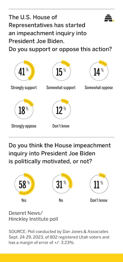 On the question of whether they support the House impeachment inquiry into President Biden, the poll shows more than half of Utah voters, or 56%, say they support it, while 32% say they oppose the investigation and 12% said they don’t know.