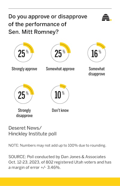 Nearly 50% of Utahns say they strongly or somewhat approve of Romney’s performance, a small decrease from September’s 54%. That’s according to the latest poll from the Deseret News and the Hinckley Institute of Politics at the University of Utah.