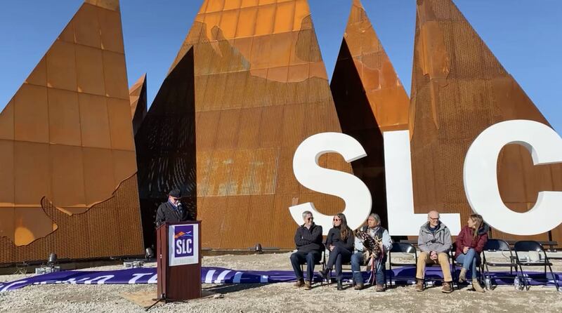 The peaks symbolize the state's five Native American tribes and the five elements of the natural world: air, earth, fire, space and water, Huether said. He also placed a glass orb near the top of the tallest peak that points to Utah's location on a globe. Giant block letters spelling out "SLC" are at the front of the sculpture and there's also a light feature that illuminates the peaks at night, too.