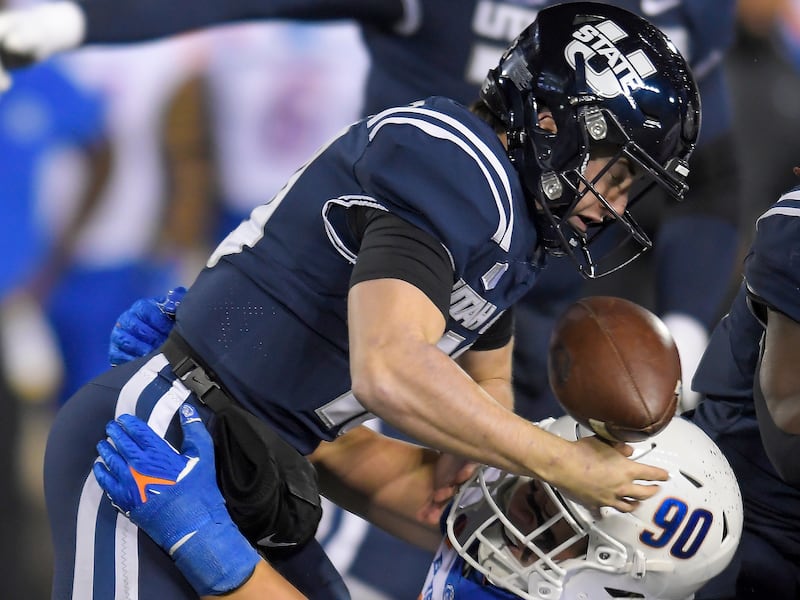 Both Cooper Legas and McCae Hillstead saw time at quarterback Saturday night for Utah State in the Aggies’ 45-10 loss at home to Boise State.