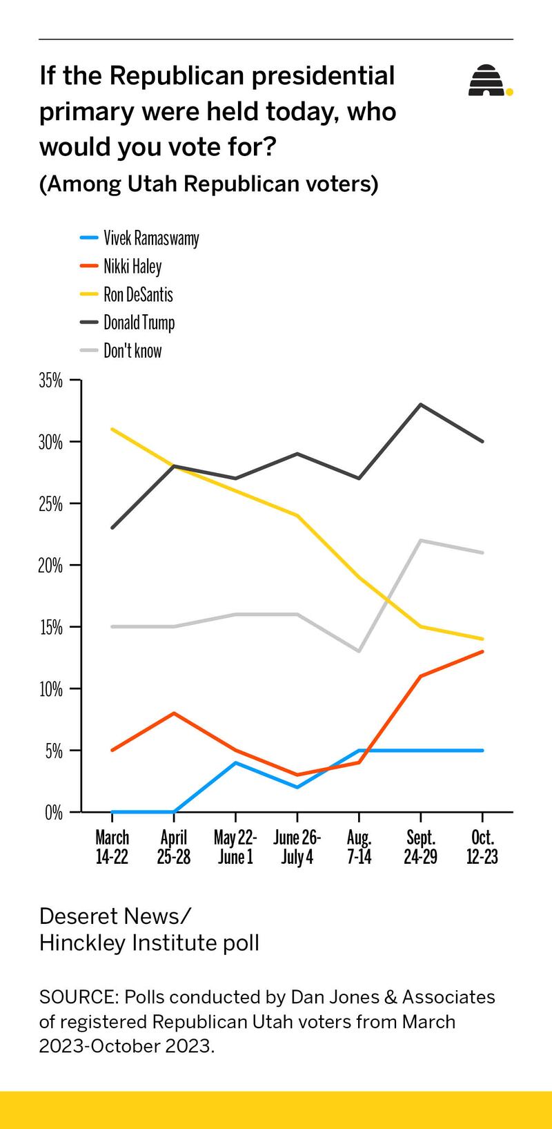 Nikki Haley is the biggest riser for the second month in a row in a new poll of Utah Republican voters, entering a statistical tie in second place with Florida Gov. Ron DeSantis.