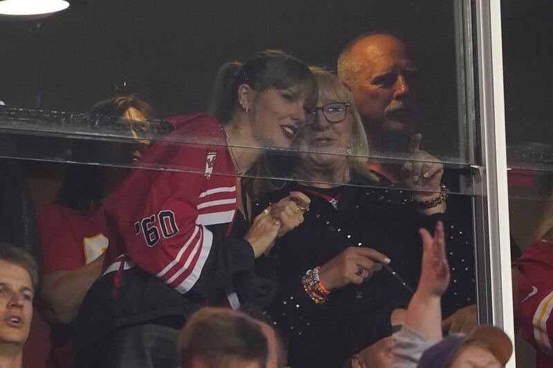 - Sept. 24, 2023: Swift was seen sitting next to Donna Kelce, his mom, at the Chiefs’ 41-10 win over the Chicago Bears. Throughout the game, the camera panned to Swift nearly as many times as it showed replays from the game itself. It also sparked the now-viral video where Kelce appears to say, “She’s right there,” while he looks up at the suite admiringly. The couple was also photographed riding away after the game in their getaway car.