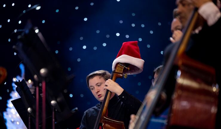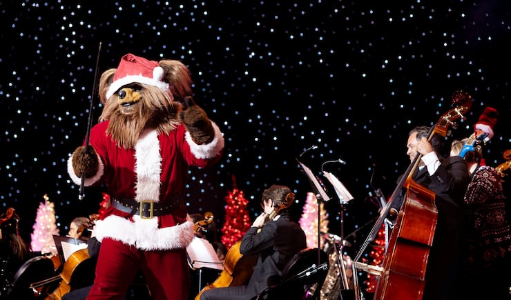 The free event celebrated its 39th year Monday night. Santa Claus came to town along with the Jazz Bear, dressed in a Santa suit, to help direct the symphony and singers.