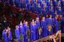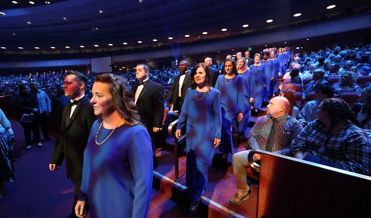The Christmas concert pulled out all the stops from start to finish. As people were still filing into their seats, members of the choir began a triumphant processional into the Conference Center, slowly descending down the steps and walking onto the stage while singing the French carol “Sing We Now of Christmas.”