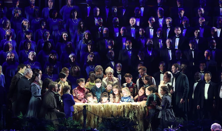 Nicol is the second “Downton Abbey” star to appear in the Christmas concert, following Hugh Bonneville in 2017. And she was quick to reference her “Downton Abbey” co-star. As she took in the sight of the bright Christmas trees lighting up the stage and the large audience before her — nearly 15,000 in attendance — Nicol recalled how Bonneville said the Conference Center made “‘Downton Abbey’ look like a toolshed.”