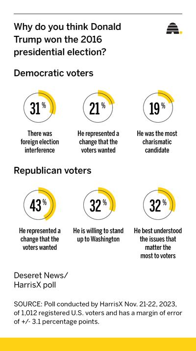 In a Deseret News/HarrisX poll of U.S. voters, the most common reason Democrats give for Hillary Clinton’s 2016 loss to Donald Trump is foreign election interference. And the most common reason Republicans give for Trump’s 2020 loss to President Joe Biden is ballot tampering.