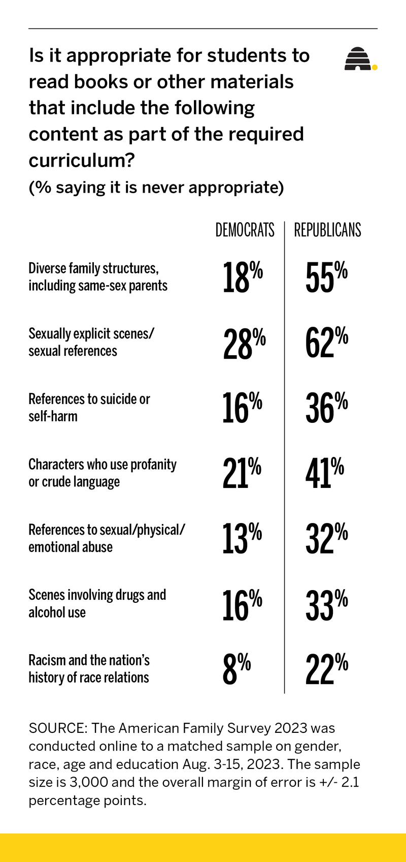 The survey showed a strong majority of Republicans, 62%, say books with sexually explicit scenes or sexual content should never be required reading for high school students, while 28% of Democrats say the same.