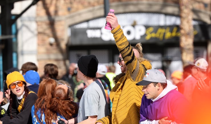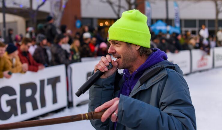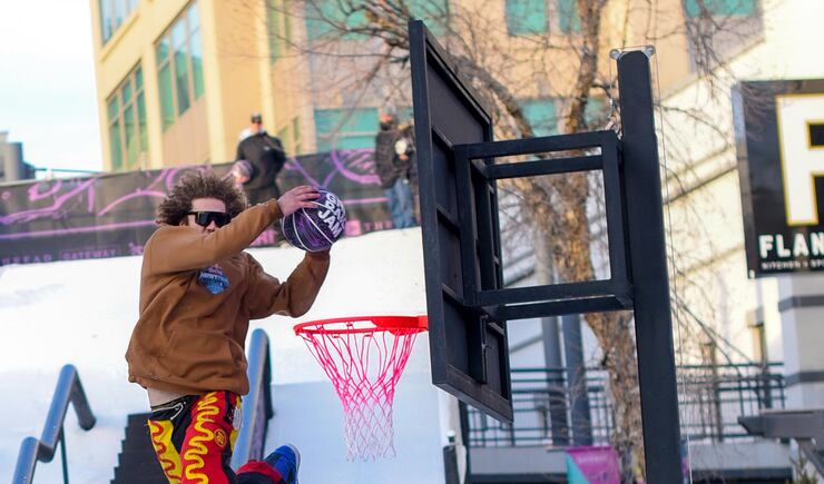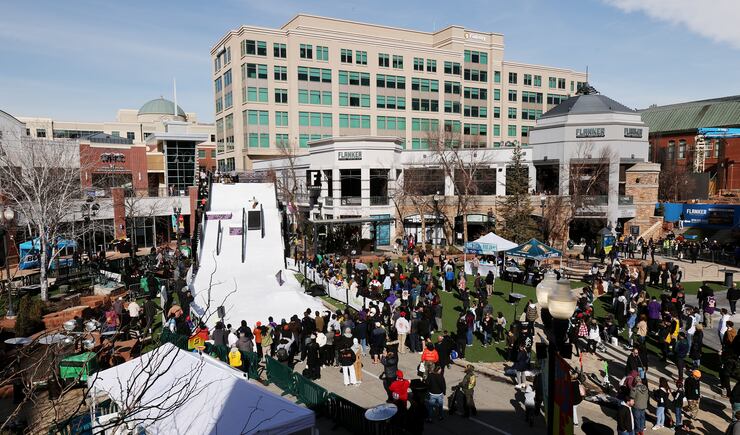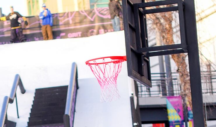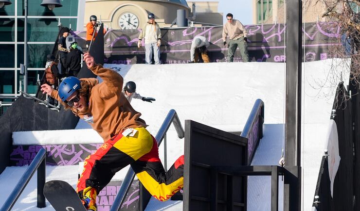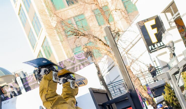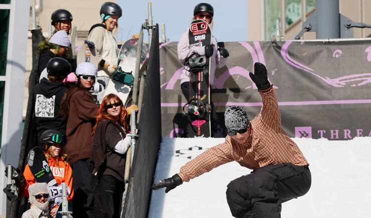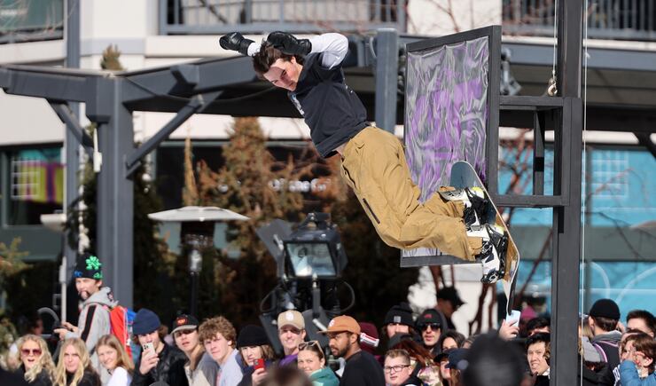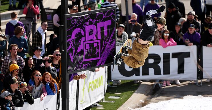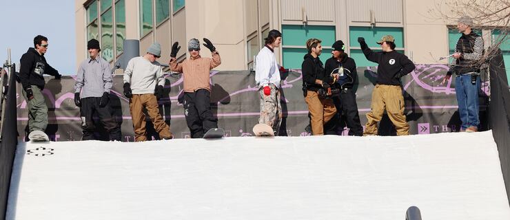 Friday, amateur snowboarders from around the country took part in the Grit Rail Jam as part of the NBA All-Star Weekend. Forty tons of ice were hauled into the outdoor space of The Gateway in Salt Lake City, shaved and packed onto a 30-foot ramp.