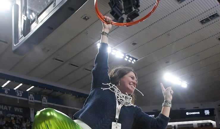 She said the pants were extremely hot and she’ll never wear them again, but they made for a helluva photo op as she hung from the rim after cutting down the net.