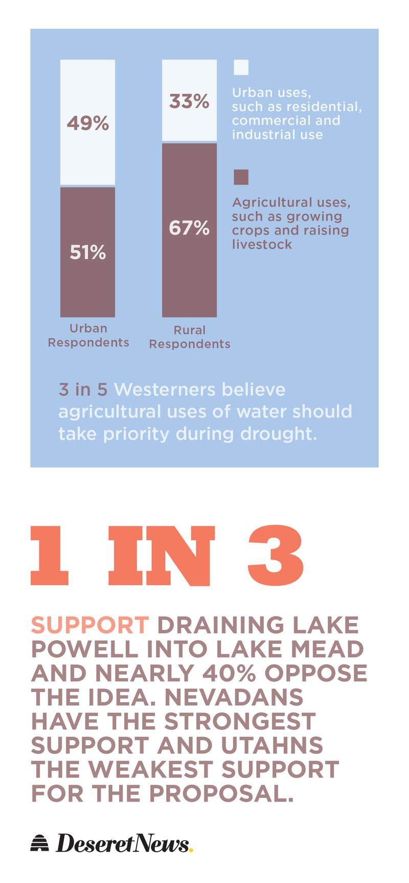 About 80 percent of respondents say water supply is of primary concern, a sentiment heightened in arid states like Utah and Arizona. Roughly the same percentage of people surveyed think access to water will continue to be an issue in 2030. Over 30 percent say Lake Powell — the nation’s second largest reservoir created by a dam along the Colorado River — should be drained. About 40 percent oppose the idea, and 30 percent aren’t sure.