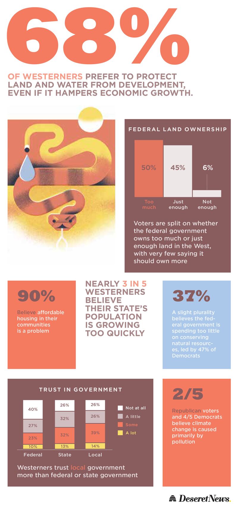 But the Deseret Magazine survey identifies a disconnect between policymakers and voters. It found 68 percent of Westerners say they prefer to protect land and water from development, even if that hampers economic growth.