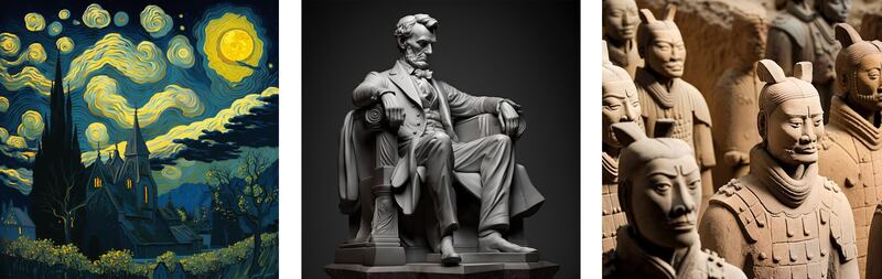 His method could well become a new model of artistic creation. While AI has been developing for decades, its capabilities in the arts have come to a head in recent years, embodied by Midjourney and numerous other art generators launched in the past year or so. There are now cellphone applications that turn selfies into illustrated avatars; text-to-image apps that render photorealism; robots with more of a penchant for the abstract; and chat bots capable of writing anything from haikus to academic papers and even novels.