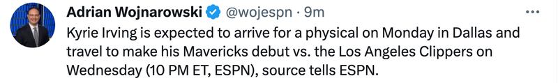 Wojnarowski reported that Irving “is expected to arrive” in Dallas on Monday and make his Mavericks debut Wednesday on the road against the LA Clippers.