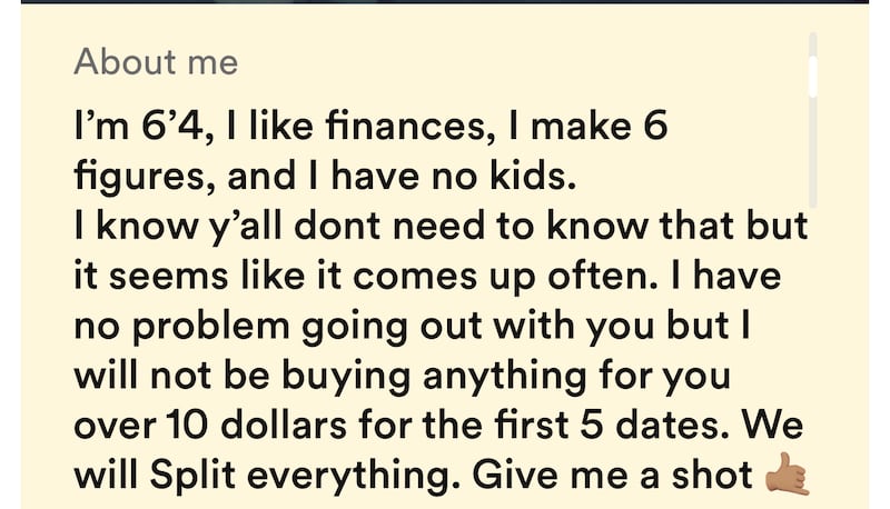 Or this one, from a guy who has no problem going out with you but will not be spending over 10 dollars, thank you very much: