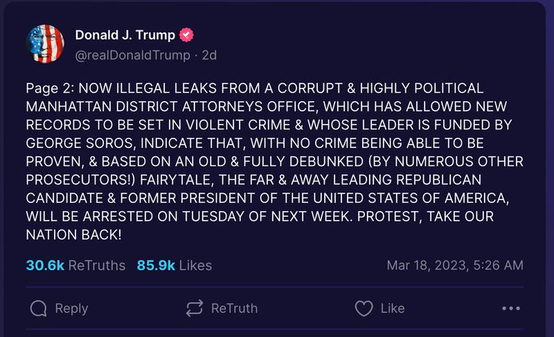 Trump asked his followers last week to “protest” if he is arrested. He predicted on Truth Social that could happen as soon as Tuesday.