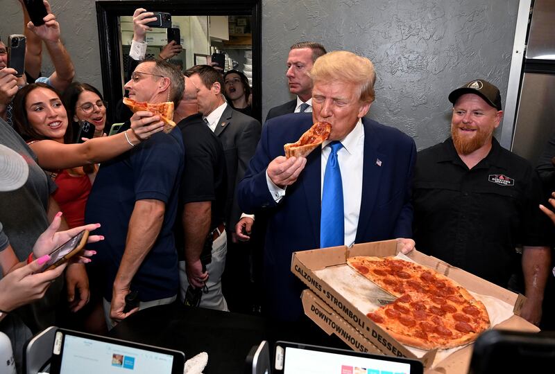 In a viral clip, he grabs a slice as the crowd around him chants “Trump! Trump! Trump.” The former president then takes a big bite, mumbles “It’s good” before asking the crowd: “Does anyone want a piece that I’ve eaten?”