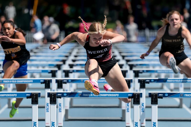 100 hurdles — 1. Eden DeVries, Weber, 14.03; 2. Nadia Chiara, Lone Peak, 14.71; 3. Sariah Gerald, Westlake, 14.85; 4. Lily Collier, American Fork, 15.22; 5. Katrina Hirst, Farmington, 15.36; 6. Madelynne Taggart, Corner Canyon, 15.41; 7. Kate Garner, Herriman, 15.54; 8. Megan Eaton, Lone Peak, 15.58.