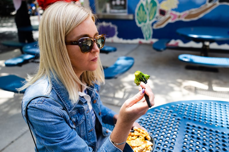 I approached slowly and introduced myself to the team of not-children-but-definitely-not-adults behind the cash register who looked puzzled by the presence of this mom without children accompanied by a photographer in Lagoon at 11:30 a.m. on a weekday. I asked as nicely as I could where the food came from if all other Teriyaki Stix are no longer in operation. They assured me that they were not reheating meat that had been sitting in the freezer since 2009 and that instead they source their ingredients through a distribution service. That answer was food-poisoning proof enough for me, so I ordered the chicken-and-vegetable combo for me, the spicy chicken bowl for Ryan the photographer, and a large Diet Coke.