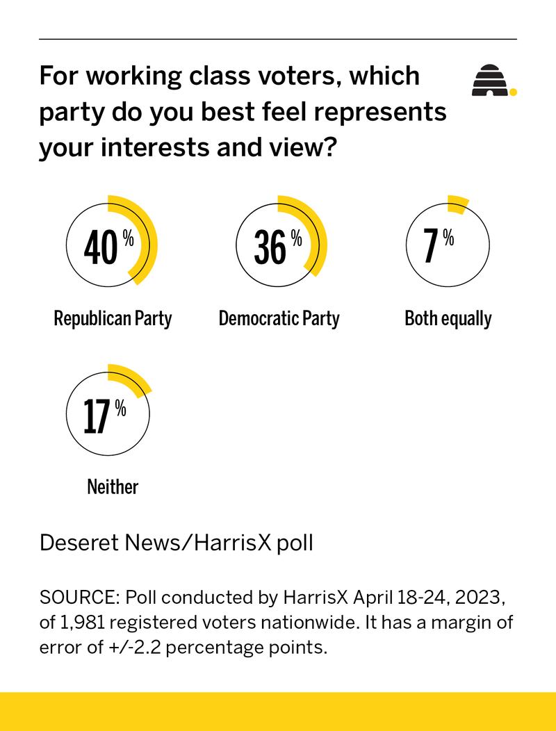 In a recent poll conducted by HarrisX for the Deseret News, 40% of self-identified working class voters said that they feel like the Republican Party best represents their interests and views, while 36% of these voters preferred the Democratic Party.