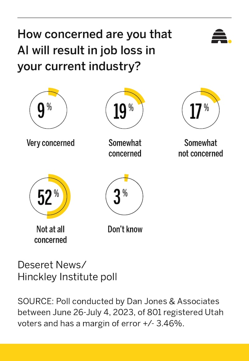 In a new statewide Deseret News/Hinckley Institute of Politics poll, Utahns shared their own level of worry about potential job losses and last month weighed in on overall concerns with new artificial intelligence-driven platforms like ChatGPT, DALL-E, Google’s Bard and others.