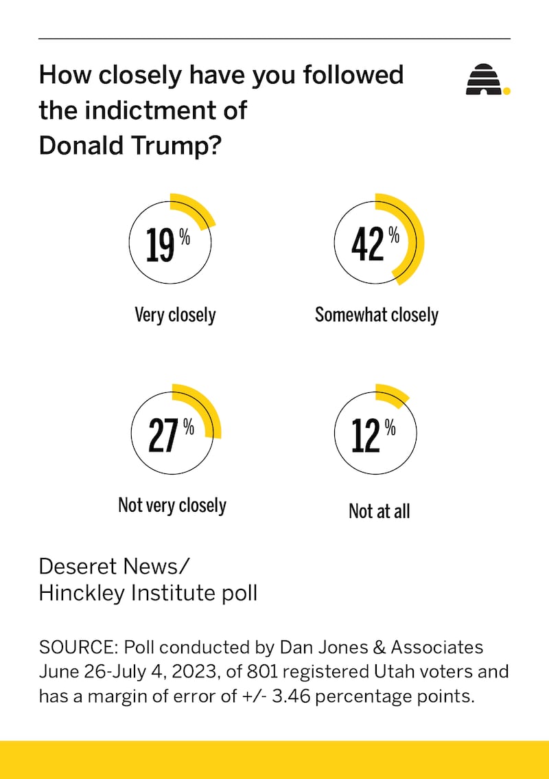 The latest poll also asked Utah voters how closely they are following news of the charges against Trump, with a plurality, 42% saying somewhat closely.