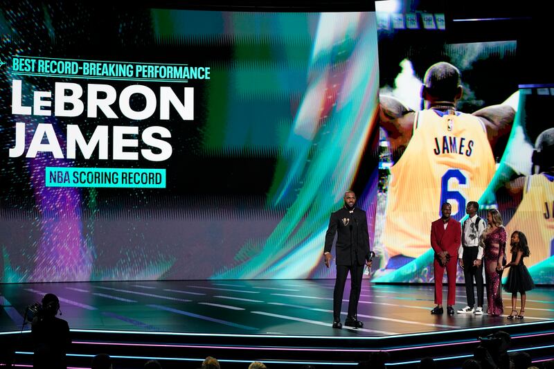 James — I’m not on a first-name basis with him, as everyone else seems to be — announced a few weeks ago that he was considering retirement after his latest hand-picked team (I can’t remember which one it is now) was eliminated from the playoffs. Did anyone really believe that? Like everything else James does, it was calculated for attention. Anyway, at last week’s ESPYs, James ended the great nonmystery by telling us: