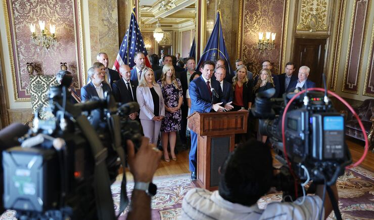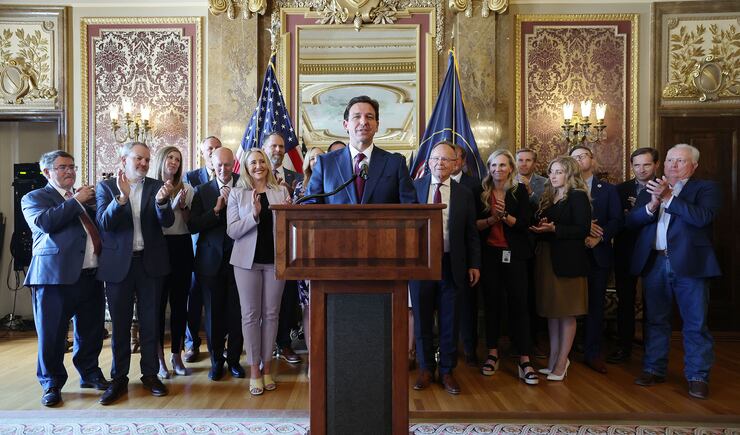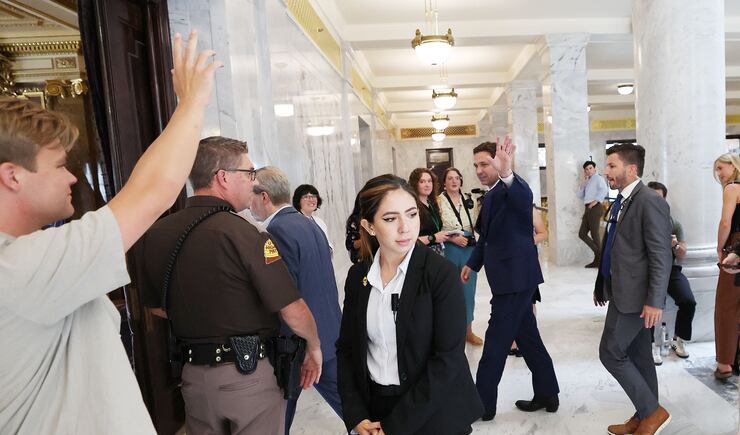 Behind DeSantis stood 17 state lawmakers and two Republican mayors who have endorsed him in his race for president. DeSantis was also expected to meet with Utah Gov. Spencer Cox while in town.