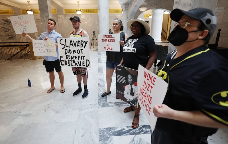 In Utah, six protesters stood outside the room at the Capitol while DeSantis spoke to register their anger over the curriculum language. One held a sign saying “slavery did not benefit the enslaved.”
