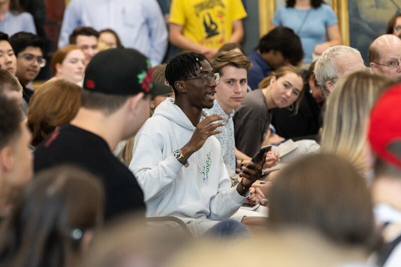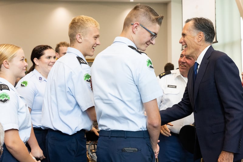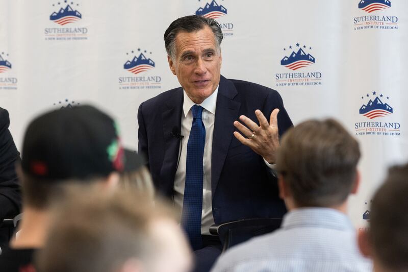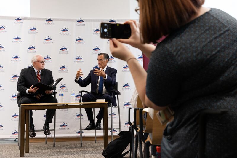 Before speaking to media, Romney addressed a room full of students at the Hinckley Institute of Politics at the University of Utah, where he took questions and spoke with Sutherland Institute President Rick Larsen.