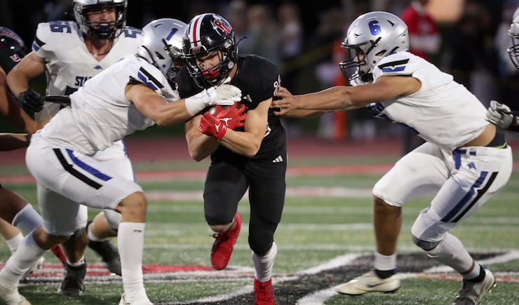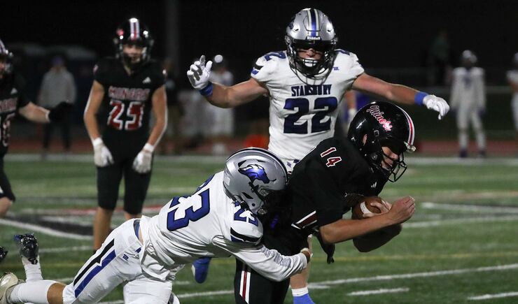 Park City’s defense forced six turnovers — which helped it overcome three turnovers of its own — to secure a hard-fought victory over the Stansbury Stallions, 21-17. Park City improved to 6-0 on the season with the win and 3-0 in Region 10. Miners quarterback Sebastian Bodily tossed 3 touchdowns in the win, including a 59-yard toss to Charlie Cusimano early in the fourth quarter which proved to be the game winner. The Park City defense held the Stansbury offense scoreless in the final 15 minutes to secure the victory. Park City forced three turnovers in the final 10 minutes.