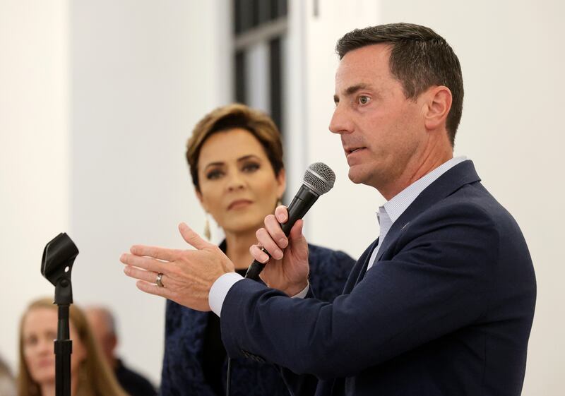 Lake said she was backing Staggs for Senate because he is an “America first” candidate — and when asked what policy priorities she sees for an America first candidate, she spoke about immigration — “securing a border that is wide open,” she said — less money spent on foreign policy and on the war in Ukraine, re-shoring American manufacturing jobs and fighting crime.
