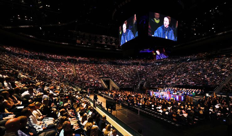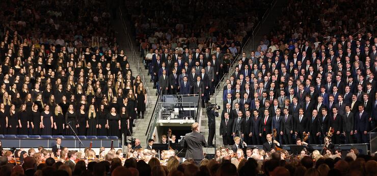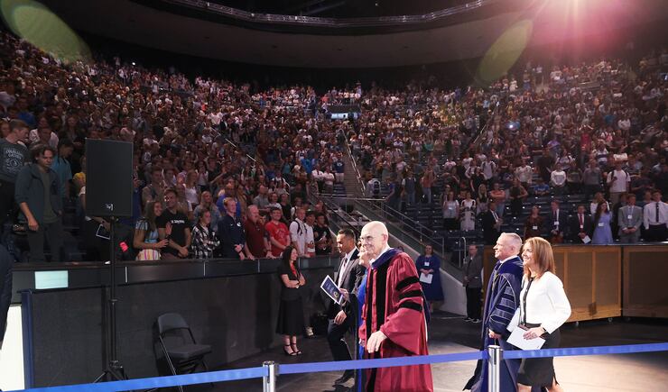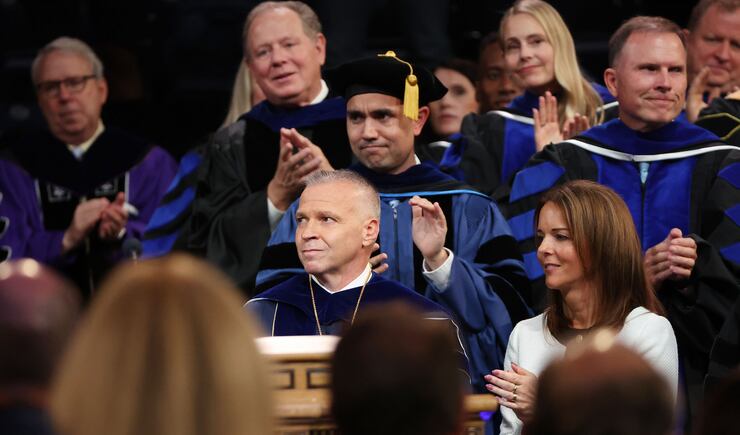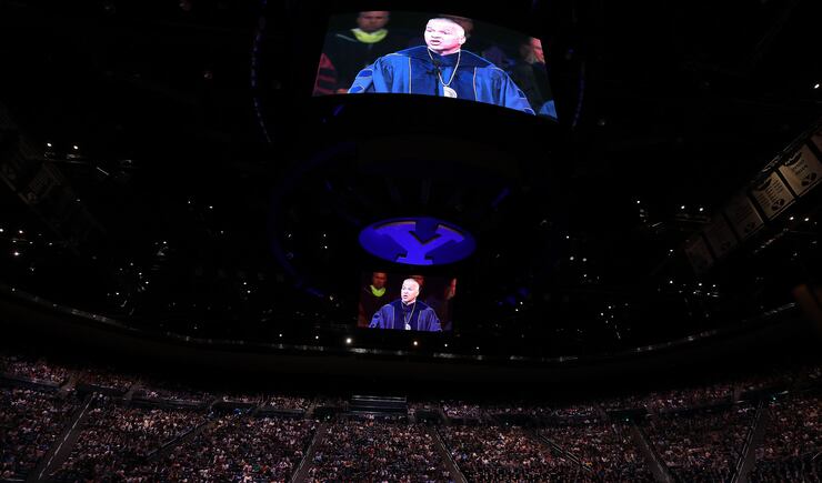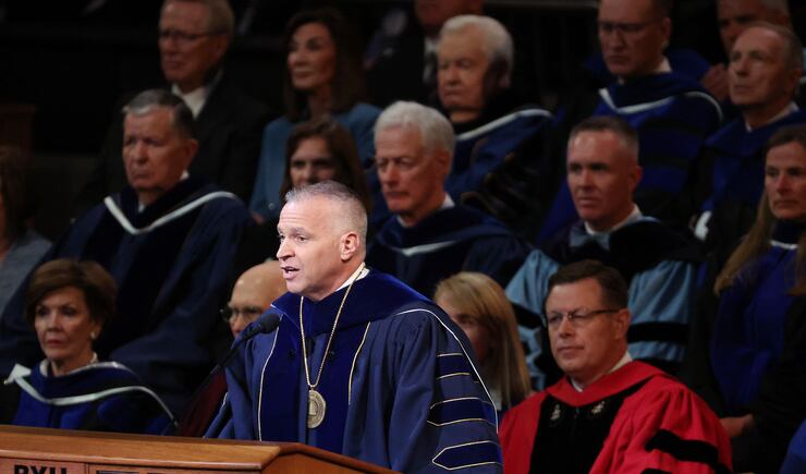 The robust ceremony in a packed Marriott Center was drenched in the orchestral pomp and academic-robed circumstance of any collegiate presidential inauguration, but unmistakably directed by the university’s sponsor, The Church of Jesus Christ of Latter-day Saints, whose leaders comprise the school’s board of trustees, led by the church’s prophet-president, Russell M. Nelson.