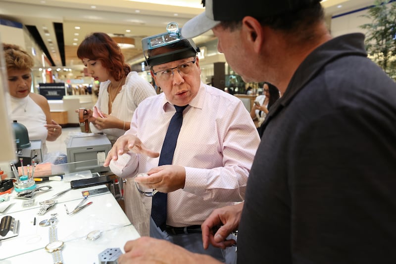 You can’t miss him. He is literally in the center of the mall. His watch repair and watch-selling business, Fashion Watch & Clock, is in a portable kiosk that mall management rolls out by the information sign and benches where worn-out spouses can take a breather.